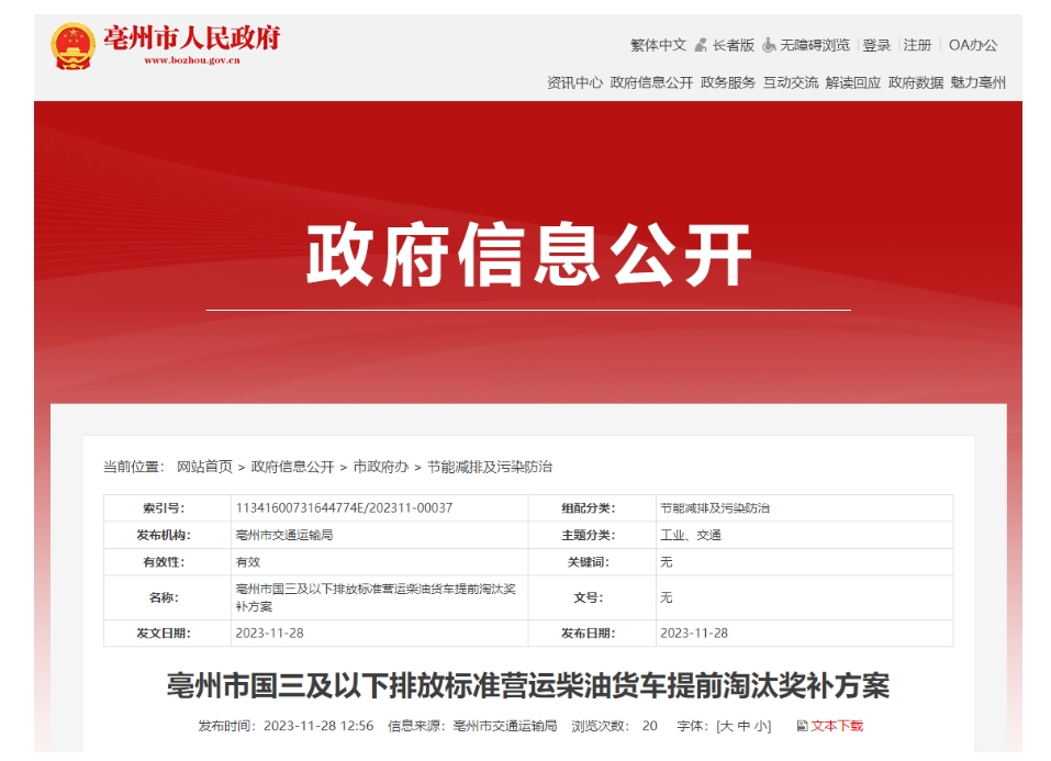 安徽省亳州市國三及以下排放標準營運柴油貨車提前淘汰獎補方案