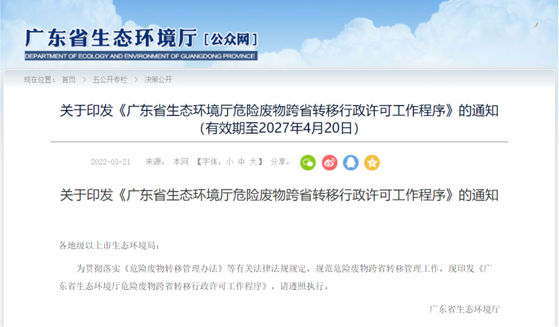 廣東省生態(tài)環(huán)境廳關(guān)于印發(fā)《廣東省生態(tài)環(huán)境廳危險廢物跨省轉(zhuǎn)移行政許可工作程序》的通知(有效期至2027年4月20日)各地級以上市生態(tài)環(huán)境局:為貫徹落實《危險廢物轉(zhuǎn)...