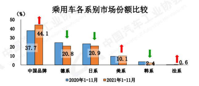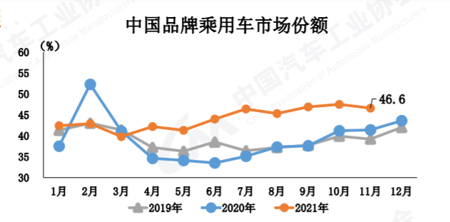 11月,中國品牌乘用車仍處于向上發(fā)展的區(qū)間,無論是銷量還是市場份額都在持續(xù)增長,已經(jīng)連續(xù)8個月保持增長。11月,中國品牌銷量達到了102.2萬輛,同比增長7.2%;市場份額上升了5.2個百分點,來到46.6%。