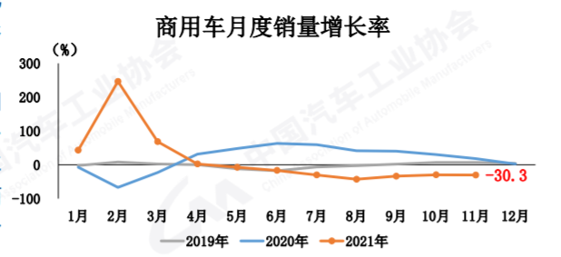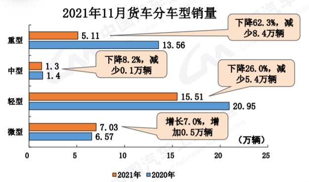 11月,商用車產(chǎn)銷分別完成35.3萬輛和33.0萬輛,環(huán)比分別增長3.2%和1.1%;同比分別下降31.9%和30.3%,降幅比10月分別擴大5和0.6個百分點。與2019年同期相比,商用車產(chǎn)銷同比下降18%和17.6%,降幅比10月分別擴大13.7和8.7個百分點。中汽協(xié)副秘書長陳士華強調(diào),受國六排放標準切換、“藍牌輕卡”政策預(yù)期帶來的消費觀望、房地產(chǎn)開發(fā)行業(yè)較冷以及前期政策紅利逐步減弱等因素影響,下半年商用車市場需求弱于上半年。