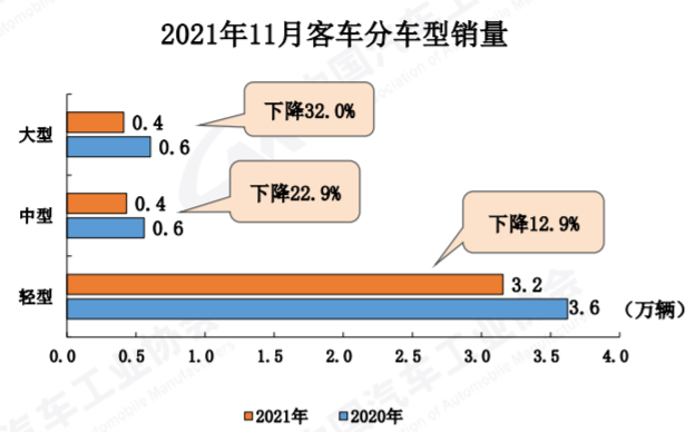 1-11月,商用車產(chǎn)銷分別完成429.3萬輛和442.9萬輛,同比分別下降9.1%和5.3%,降幅比1-10月均擴大2.8個百分點。其中,客車增幅回落,貨車降幅擴大。與2019年同期相比,商用車產(chǎn)銷同比增長11.1%和14.2%,增幅比1-10月分別回落3.7和3.6個百分點。