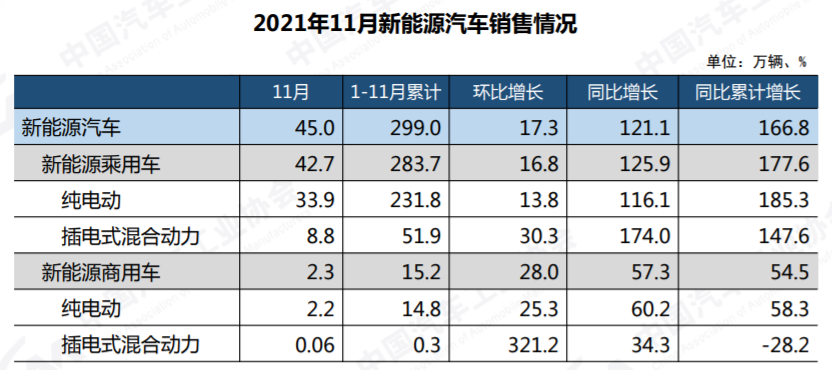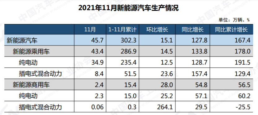 1-11月,新能源汽車產(chǎn)銷分別完成302.3萬輛和299萬輛,同比均增長1.7倍;市場滲透率達到12.7%,高于前10月。11個月的時間,新能源汽車銷量就達到299萬輛,表明我國新能源汽車行業(yè)已經(jīng)由政策驅(qū)動轉(zhuǎn)向市場拉動。