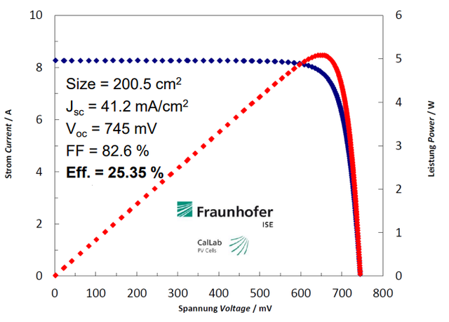 瑞士電子與微技術(shù)中心CSEM,聯(lián)合設(shè)備廠商Meyer Burger和EPFL,提出了低成本的Tunnel-HBC電池工藝,Voc達到了745mV,電池轉(zhuǎn)換效率高達25.35%。見下圖: