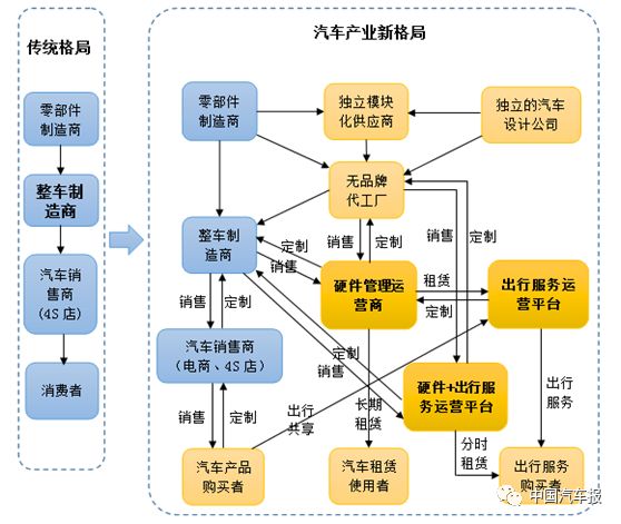 隨著汽車消費(fèi)側(cè)出現(xiàn)消費(fèi)者從買車到租車,從購(gòu)買汽車產(chǎn)品轉(zhuǎn)向購(gòu)買出行服務(wù),傳統(tǒng)整車企業(yè)通過產(chǎn)品品牌對(duì)消費(fèi)者的影響力減弱;隨著汽車電動(dòng)化、數(shù)字化、網(wǎng)絡(luò)化和平臺(tái)化的發(fā)展趨向,傳統(tǒng)整車企業(yè)通過垂直分工體系對(duì)供應(yīng)鏈的控制力逐步減弱;隨著具有典型互聯(lián)網(wǎng)模式、對(duì)消費(fèi)者偏好和需求有充分了解的平臺(tái)公司崛起,以傳統(tǒng)整車企業(yè)為中心的產(chǎn)業(yè)流程正在改變,產(chǎn)業(yè)重心正在從汽車制造向出行服務(wù)轉(zhuǎn)移。汽車產(chǎn)業(yè)經(jīng)歷了上百年的發(fā)展,以傳統(tǒng)整車企業(yè)為中心、大規(guī)模生產(chǎn)和大規(guī)模銷售模式為主導(dǎo)的傳統(tǒng)汽車產(chǎn)業(yè)格局正在走向以滿足個(gè)性化消費(fèi)和出行服務(wù)為中心的新產(chǎn)業(yè)格局。下圖為汽車傳統(tǒng)產(chǎn)業(yè)格局和新產(chǎn)業(yè)格局的對(duì)比。
