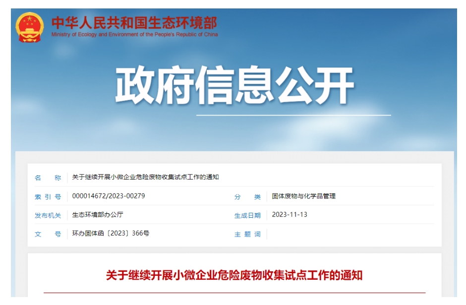 生態(tài)環(huán)境部關(guān)于繼續(xù)開展小微企業(yè)危險廢物收集試點工作的通知