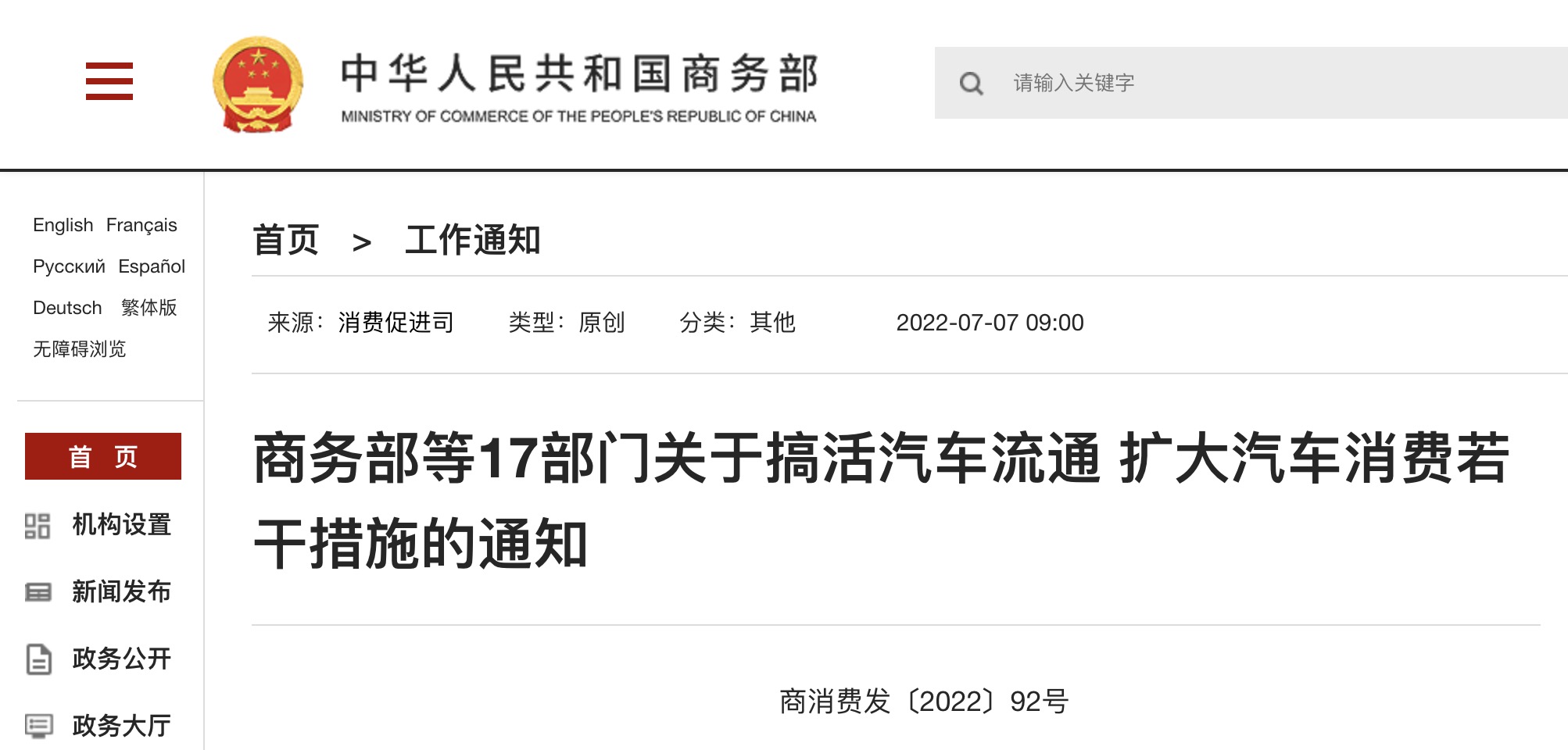 商消費(fèi)發(fā)〔2022〕92號(hào)各省、自治區(qū)、直轄市人民政府,新疆生產(chǎn)建設(shè)兵團(tuán):汽車業(yè)是國(guó)民經(jīng)濟(jì)的戰(zhàn)略性、支柱性產(chǎn)業(yè)。為進(jìn)一步搞活汽車流通,擴(kuò)大汽車消費(fèi),助力穩(wěn)定經(jīng)濟(jì)...