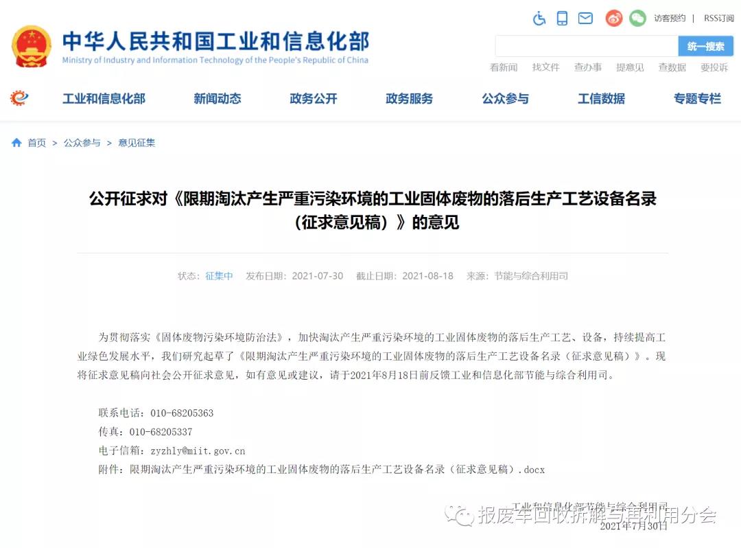 為貫徹落實(shí)《固體廢物污染環(huán)境防治法》,加快淘汰產(chǎn)生嚴(yán)重污染環(huán)境的工業(yè)固體廢物的落后生產(chǎn)工藝、設(shè)備,持續(xù)提高工業(yè)綠色發(fā)展水平,我們研究起草了《限期淘汰產(chǎn)生嚴(yán)重污染環(huán)境的工業(yè)固體廢物的落后生產(chǎn)工藝設(shè)備名錄(征求意見(jiàn)稿)》?,F(xiàn)將征求意見(jiàn)稿向社會(huì)公開(kāi)征求意見(jiàn),如有意見(jiàn)或建議,請(qǐng)于2021年8月18日前反饋工業(yè)和信息化部節(jié)能與綜合利用司。